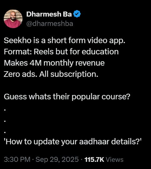 “How to update your Aadhaar card?” It seems like a simple question, one we often overlook. But what if we told you that answering questions like this could help you build a profitable business? That’s exactly what Seekho has done. Positioning itself as a ‘Netflix for Education,’ this short-form video company has grown to generate a monthly revenue of 4 million. Check out Dharmesh BA’s latest Substack post, where he breaks down Seekho’s business model.